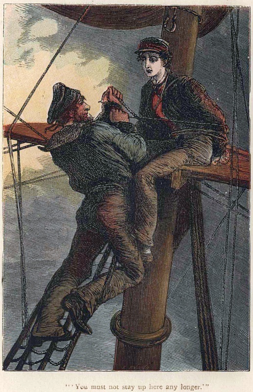 “They will not do that, sir, they will not do that,” answered Hadow in a despairing tone. “I am bound hand and foot to them; their fate, whatever that is, must be mine. You must not stay up here longer. I will cast off the lashings now, but you must take care, as your arms will be stiff after being bound so long, that you don’t fall. I will hold you till you get the use of them.”