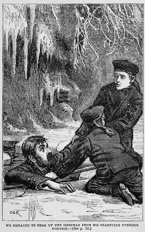 It was cold enough during the day, but it was still colder at night; notwithstanding this, as Alec and I had had no sleep for many hours, we found it difficult to keep awake. We, therefore, rolling ourselves up in our wraps, lay down, while Hugh stood ready to call us at a moment’s notice. There were, however, sentries enough to keep a look-out, and Uncle Donald continued going round and round the fort, seeing that they were watchful.