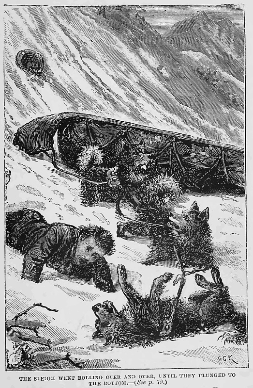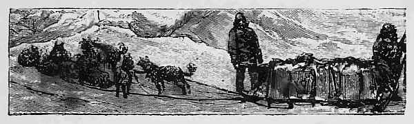 We had both knelt down behind the bush, with our rifles ready to raise to our shoulders at any minute. Alec, only the moment before I returned, had thrown some wood on the fire, so that it was now blazing up brightly, and we could see all the objects round it. Just then three figures appeared. Two were Indians—there could be no doubt about it; but the other we could not make out clearly. They advanced, looking eagerly around, but as they came more into the light, instead of savages, with scalping knives in hand ready to kill us, great was our joy to discover that one was Pierre, and the others Red Squirrel and Kondiarak. They looked very much astonished at not seeing us. We did not keep them long in suspense, and Pierre then told us that they had come on purpose to advise that we should at once return to the fort, without waiting for daylight. They had been successful in hunting, having killed three buffalo cows, with the meat of which the sleighs were already packed, and as the track was formed, the dogs would find their way without the slightest difficulty.