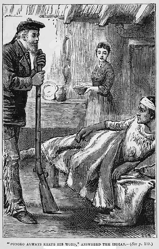 “If my people come, you shall carry me out on a litter; I will tell them how well the Pale-faces have treated me, and will urge them, instead of fighting, to make a lasting peace with my white father and his friends,” said Ponoko.