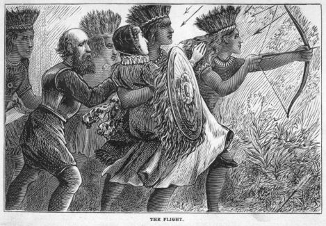 “Give not way to despair, my daughters,” he exclaimed; “you have still many sons. We will fly with them to a place of safety, and there teach them how their brave fathers fought and died with their faces to the foe. They will grow up, and, hearing of their deeds, will imitate their valour, and revenge the deaths of their sires.”