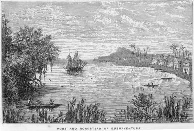 Heavy weather coming on, the schooner ran into the port of Buenaventura. Beyond the bay, opening into it, is a lagoon of considerable extent. On one side is the town, a great part of which is built on piles at the water’s edge. The place has but little to recommend it; indeed, there are scarcely a dozen houses of any size, while the rest of the buildings have a miserable appearance both without and within. Above the town stands the church,—a building of no architectural pretensions, and greatly resembling a barn. Buenaventura is the port of a considerable district, embracing the valley of the Cauca. The climate, however, owing to the constant damp and heat, which produce intermittent fevers, prevents foreigners from residing here; indeed, it rains nearly every day in the year.