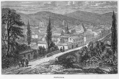 In the western half of New Granada are three ranges of lofty mountains, into which the main branch of the Andes is divided, extending from Quito northwards to the Caribbean Sea; a fourth branch, running close to the shores of the Pacific, extends towards the Isthmus of Panama. These four ranges form three valleys, elevated, however, a considerable distance above the sea. Throughout that to the east runs the magnificent river Magdalena; the next is watered by the Cauca, of equal length; and the third valley by the Atrato, of less extent, which runs into the Gulf of Darien. At the head of the centre valley—that of the Cauca—is situated Popayan, the capital of the province of the same name, in the midst of a beautiful plain, almost surrounded by two streams, which finish their course about a league below it, when they fall into the fine river Cauca. This river then runs to the northward through the rich and charming valley of the Cauca. Nothing can be more delicious than the climate of this region, the inhabitants being never oppressed by excessive heat, or annoyed by extreme cold. Rain, however, falls during the last three months of the year, and also in April and May; but even at that period the mornings are fine, as the showers seldom come on until two or three o’clock in the afternoon, and continue during the night. The plain, or I may call it the wide valley of