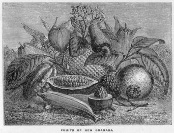 our ride, we did ample justice. Mr Laffan complimented Dona Maria on the fruits produced on the estate. Indeed, when I afterwards left my native valley, I learned to appreciate them, by comparison with the productions of other regions. Nothing, indeed, can surpass the flavour of the chirimoya, a fruit sometimes double the size of a cocoa-nut, tasting like a mixture of strawberries, cream, and sugar, with a fragrance far superior to any mixture. Then the caymato (in shape like a lemon, but far sweeter, with scarcely a touch of the acidity of the lemon), a species of lime, and the pomegranates, oranges, and strawberries, one of which was a mouthful, and figs unsurpassed in any other country. Then there was the mamei, a fruit as large as a water-melon, very nice, fresh, and not to be despised when preserved. Then there were several sorts of pine apples, and a variety of melons. Indeed, the climate of this region is especially favourable to the production of fruit, as the thermometer seldom falls below 68 degrees, and never rises much above 76 degrees. Then the wine and the lemonade were delightfully cooled by ice; an ample supply of snow being constantly brought down from the mountain of Purace, distant little more than a day’s journey.