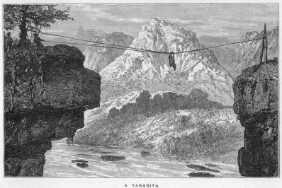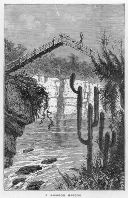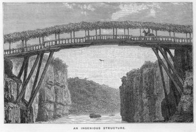 I had ridden forward, curious to examine the structure of the bridge of which our guides had spoken. I found that strong timbers had been fixed on the ledges in the cliffs projecting over the stream, serving to support a platform; from this platform others were pushed forward on either side, the inner ends lashed to the first platform, while a centre one joined the two. Railings ran along on either side of this ingenious structure, which had a roof supported on poles—the object apparently being to prevent the wood-work from rotting with the wet.