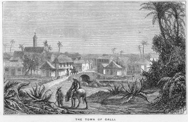 Popayan, lies between two ranges of lofty mountains. On one side are the Cordilleras, with Purace, eternally covered with snow, rising above them; and on the west side is another range, which separates the valley from the province of Buenaventura. In the midst, surrounded by trees, appears Popayan, with its numerous churches and large convents, distinguished at a considerable distance by their whiteness. It is one of the most ancient towns in that part of the continent. Its founders, companions of Sebastian Belalcazar, made it the capital of the province, establishing a bishopric, a college, and numerous religious institutions. Although its buildings might not be greatly admired in Europe, the inhabitants are proud of them; and justly so, when the difficulties under which they were erected are remembered. Every article used in their construction had to be brought either on the backs of men or mules; and there were few native craftsmen capable of performing the necessary work. Many families proud of their ancient descent were settled in the town, and its society was therefore superior to that of any of the surrounding places. In Popayan is a large square, of which I shall have to speak by-and-by, with the cathedral on one side, and the residences of some of the principal people in the town occupying the other sides. There were, besides, several churches, four convents, and two nunneries. To the north of the city, towards the Cauca, is the handsomest bridge in that part of the country. From the town, in the early part of the morning, when the sun shines on them, can be seen the Cordilleras of Chicquio, and at a less distance rises the Paramos of Puxana and Soltana, presenting a magnificent appearance.