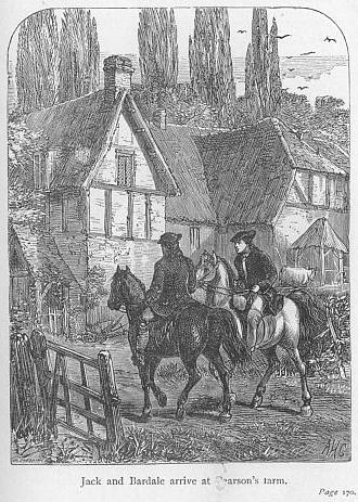 On reaching the door of Mr Deane’s house, Jack held the young lady’s bridle while she dismounted, and then insisted on taking her horse and her father’s round to the stables while they entered the house. Having unsaddled the steeds, and given them some corn and hay, he hurried off to fulfil his intention of restoring Dame Pitt’s cow to her; but he was less successful in executing his purpose of thrashing the apprentices, in consequence, as he expected would be the case, of their judiciously keeping out of his way; when, failing in his efforts to discover them, he returned home, feeling that he might defer the execution of his purpose to another opportunity, should he on further consideration deem it necessary.