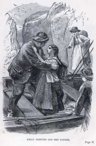 Nelly meantime was filling her creel with fish, that she might lessen the weight of the baskets which her father and Michael had to lift on shore. As soon as it was full she stepped back on the rock, giving a kiss to Michael as she passed him.