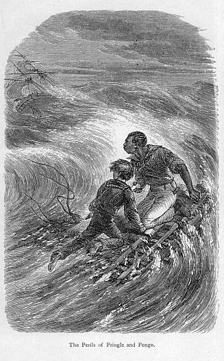 other side of it. The grating was moving towards me. I struck out to make it, and then I saw that it was pushed by a negro. “Keep up, Massa Pringle, keep up,” said a voice in a cheery tone, which I recognised as that of Peter Pongo. My spirits returned. I had been a careless, thoughtless fellow, but I prayed then as I never prayed before, that the dreadful sharks might be kept from me, that I might reach the grating, and might by some means or other be saved. I felt a strength and courage I had not felt before. I struck out with all my power, still it seemed very very long before I reached the grating, and in my agitation I almost sank as I was catching hold of it. Peter Pongo had, however, sprang on to it and caught hold of me. I soon recovered. Words enough did not just then come into my head to thank him, but I took his hand, and he understood me. So far I was safe, for the grating was large enough to hold us both, but the sea was rapidly rising, and we might easily again be washed off. We looked about us, the schooner had not yet tacked, and the squall had already caught her. She was heeling over on her beam-ends, and everything seemed in confusion on board—yards swinging about, ropes flying away, and sails shivering to tatters. It was late in the evening, the sky was obscured, and darkness was coming on. The seas, too, began to dance wildly about us; their white tops, curling over and leaving dark cavern-looking hollows underneath, into which it seemed every instant that we must glide and be swallowed up. The prospect altogether was gloomy in the extreme. I felt how much I owed to poor Peter Pongo, who had voluntarily exposed himself to it for my sake, and I felt that had he not done so, I should long before this have been numbered with the dead. I still thought that we should both be saved. There were some bits of rope fastened to the grating, and by these we lashed ourselves to it, or we should inevitably have been washed off. We were constantly under water, but as it was warm that did not signify, as we soon again came to the surface. Our fear was lest some hungry shark should make a dart at us on those occasions and pick us off. Darker and darker it grew, the seas as they dashed wildly about made a loud prolonged roar, and at last, as we cast our eyes forward, not a glimpse of the schooner could we see. As the conviction of our forlorn condition broke upon me—I could not help it—I gave way to tears. I could not wring my hands because they were busy holding on to the grating. I thought of you, mother, and papa, and dear Harry, and our sisters, and that I should never see you any more; or old England, or the Hall, or Uncle Tom, or any of my friends. Peter wasn’t so unhappy, because he had no friends remaining, and his native village was in ruins. The darkness came thicker and thicker down upon us. Nothing could we see but the dark waves rising up on every side against the sky. Not a star was visible. We no longer, indeed, knew in which direction to look for the schooner. It appeared, I remember exactly, as if we were being tossed about inside a black ball. I could not calculate how long a time had passed since I had fallen overboard, when I began to feel very hungry. I had had a bit of biscuit in my pocket, but that had been lost with my jacket, and now I had nothing to eat. I bore it for some time, and then I felt very faint, and thought that I could not possibly hold on any longer. Still I did my best not to let go, and every now and then Peter spoke to me and encouraged me, “Neber fear, massa,” said he. “Him you tell me of, live up in sky, Him watch over us.” We did not speak much, however; we could not, I do not know why. Oh, that was a dreary, awful night, not likely to be forgotten! Yet here I am alive. I shall never despair after that, and shall always feel, in however terrible a position I am placed, that a merciful God is watching over me, and that He will find means to save me.
