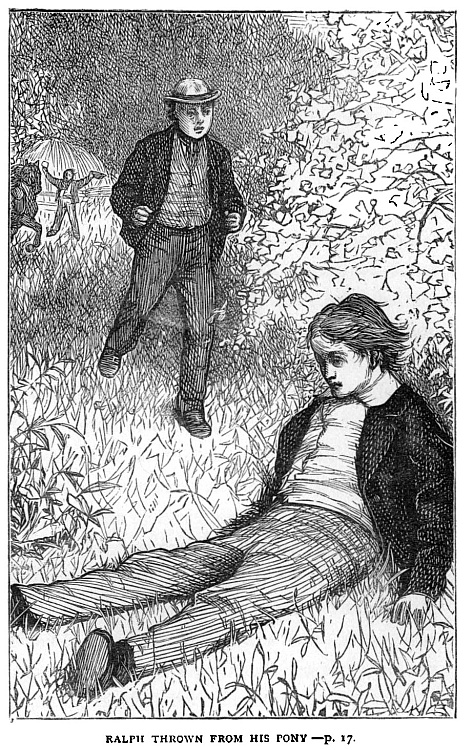 Ralph galloped on till his pony was close up to the old woman, at a spot where the ground was rough, and there was a somewhat steep descent. He could scarcely have intended actually to ride over the old woman. Just then she heard the pony’s hoofs strike the ground close behind her. She started on one side, and the pony dashed on, shying as he did so. The animal’s foot at that moment struck against a piece of hard clay, and already almost exhausted, down he came, throwing his rider to a considerable distance over his head on the ground. Lilly slipped off her well-trained little pony, which stood perfectly still while she ran to her cousin’s assistance. Ralph’s countenance was pale as death. He groaned heavily, and was evidently much hurt. His pony, as soon as it got up, trotted off to a distance to avoid the beating its young master might have bestowed.