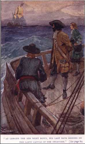 “I was sitting in the shade and reading, good uncle,” answered Roger in a brisk tone, which showed that he had little fear of the Colonel’s displeasure; “besides, to say the truth, I was watching a fine ship standing in for the coast, which ship I have a notion has come to anchor not far from this, and as soon as Stephen and I have stowed away some food, with yours and my father’s leave and good pleasure we propose going on board her to learn what cargo she carries, whither she is bound, and all about her.”