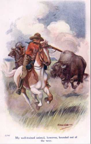 Such was the scene which met my eyes just before I fell asleep, rolled up like the rest in buffalo-robes with a knapsack for my pillow, the snow my couch, and the sky glittering brightly with countless stars overhead; and such was the scene which our camp presented night after night. We had got within three days’ journey of our destination, when numerous buffaloes were seen in the far distance; and as it was important to secure some fresh meat, Mr Meredith ordered a halt, that the hunters might go in chase of the animals. It was supposed that the buffaloes were moving away to the westward, and that another opportunity of hunting them might not occur during the winter.
