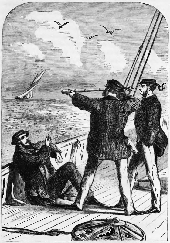 “Who’s for the first boat?” sung out Ned Hearty, the owner of the “Frolic.” Ned had tried shooting, hunting, and every other amusement which the brain of man has invented to kill time; and he was now trying yachting, which he seemed to enjoy amazingly, though practically he knew very little about it; but I never met a man, green from the shore, so ’cute in taking in the details of marine affairs. In a week he could box the compass, knew the names of all the sails and most of the ropes of his craft, and had a slight notion of steering, though I’ll wager he never touched a tiller in his life before. “I say, old fellow,” he continued, turning to me—I had joined him the day before, and had taken up my quarters on board for a spell—“do you take charge of the first gig, and see some of the ladies safe on board. Send her back, though, for the two boats won’t hold us all, and the Cardiffs and Lorimer have not come down yet.”