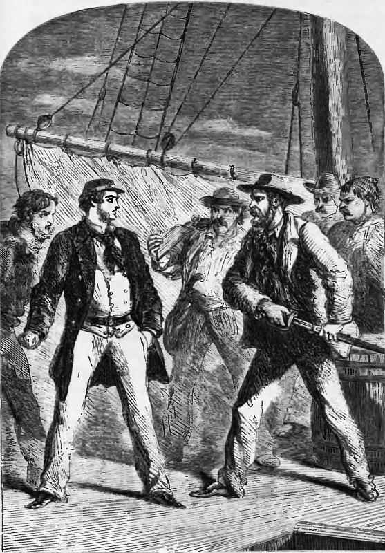 Thus the worthy Bubble ran on, giving way to the exuberance of his feelings and sympathy for his friends. Every yard of canvas the cutter could carry was pressed on her, and each moment rapidly decreased our distance from the raft; for that a raft it was, or a piece of a wreck, there could be no doubt. Our telescopes were kept unchangeably fixed on it. It was with no little apprehension, however, as we drew nearer, that I perceived that there were but three persons on it. One was standing up; the other two were seated on benches, or chests, or something of the same size, secured to the raft. The figure standing up was that of a man in the Greek costume; the other two were females. I had little doubt in my own mind who they were. As we got still nearer I fancied that, under the Greek cap, I could distinguish the features of Miles Sandgate. The features of the ladies were more difficult to make out, but I heard Hearty exclaim, “Yes, it is her—it is her!” meaning Miss Mizen; and I felt sure he was right. But who was the other person? The figure was not like that of either Mrs Mizen or Mrs Seton, but whether it was Jane Seton or Mrs Skyscraper was the question. Poor Carstairs, he must have felt that, in all probability, it was Miss Seton. What would Sandgate do when he found himself thus completely brought to bay? It was a serious question, for he had the two ladies entirely in his power, and, had he chosen, might, holding them as hostages, make any terms with us he pleased. I saw him watching the approaching cutter. He must have recognised her as soon as she hove in sight. Yet he did not quail, but stood up boldly confronting us. Then he seemed to be addressing one of the ladies. I looked again; I was certain she was Jane Seton; and I clearly recognised Miss Mizen. Jane had given her hand to Laura. The pirate seemed to be urging her to fulfil some request; he half knelt before her with uplifted hands; then he sprang up, with a look of bitter reproach. By this time the cutter was close up to the raft, and a boat was on the point of being lowered. Again, with an imploring gesture, the pirate urged his suit. Miss Seton shook her head. He seized her hand. She struggled violently. It appeared that, in his rage, he was about to drag her into the water. He would have succeeded, had not Miss Mizen held her hand and drawn her back.