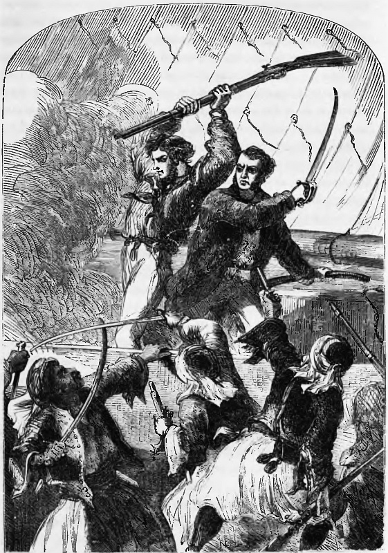 The orders were comprehended, and executed promptly and well. Cries and groans and shouts from the row-boats followed the simultaneous discharge from our great-guns and small-arms. The pirates ceased rowing, and a second intervened before they fired in return, but their shot generally flew wide of us, our unexpected commencement of the action having evidently thrown them into not a little confusion. For an instant it occurred to me that we might have been too precipitate, and that perhaps after all they might not have been pirates, but for some reason or other had come off to us at that unseasonable hour. It was therefore, in one respect, a positive relief to me when they began to fire, and I discovered their real character. Still undaunted, on they came. Before, however, they could get alongside, our people had time to load again and fire; this time not a shot but took effect. The Moors did not relish the dose; some attempted to spring on board, but were driven back by pike and cutlass into the sea, Hearty setting the example of activity and courage by rushing here and there, cutting and thrusting and slashing away, so that he did the work of half a dozen men. Indeed I may say the same without vanity of all on board, or we could not have contended for a minute against the fearful odds opposed to us. The low deck of a yacht, it must be remembered, does not present the difficulties to assailants which even a brig-of-war or an ordinary high-sided merchantman is capable of doing. Ours was literally a hand-to-hand fight without the slightest protection, our slight bulwarks alone separating us from our enemies when they once got alongside. Happily the breeze increased, and giving us way through the water, the Moorish boats having failed to hook on to us, we once more slipped through them. Some of the men in the bows continued firing at us, but a little delay occurred before the rest could get out their oars to follow the cutter. The chiefs of each boat appeared to be holding a consultation, and I only hoped that they would come to the decision that the grapes were sour, or rather that the game was not worth the candle to play it by, as the Frenchmen say, and give up the pursuit. But they were not so reasonable; they probably thought that if we fought so desperately we had something on board worth fighting for; not considering that our lives and liberties were of very much consequence, and so they showed a resolution once more to attempt to overhaul us. This hesitation was much to our advantage, as it enabled us once more to load our guns up to the muzzle, and to take a steady aim as they came up. In all my fighting experience I have come to the conclusion that there is no system equal to that of waiting for a good opportunity, mustering all resources, and then, once having begun the attack, to continue at the work without relaxing a moment till the day is won. The Moorish pirates did not follow this course. At last came the tug of war. Their fury and thirst for vengeance was now added to their greed for plunder, and the boats ranged up on either side of the little “Frolic” with seemingly a full determination on the part of their crews to overpower us at once.