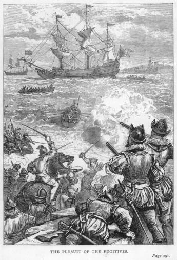 I was very eager to return to England, and happily found a merchant vessel at the mouth of the Meuse on the point of sailing. I did my best to persuade A’Dale to accompany me. He confessed that the life he led on board the rover fleet was not altogether to his taste. They had on several occasions been very nearly starved, as they were when they arrived before Brill. He had, however, collected a considerable amount of booty, and, being a prudent man, he had not gambled it away, as some of his companions had done. He could now also, without dishonour, retire. We both of us visited Captain Treslong, and I explained that I was in the service of Sir Thomas Gresham, whom he well knew, and that probably A’Dale would be again employed if he returned to him. I truly rejoiced when the captain gave him leave to retire and go with me and my two attendants on board the vessel I spoke of.