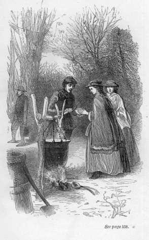 The snow became every day harder, till a crust formed on the top of it, which made walking over it where it was not beaten down, both difficult and painful. Some Indians had encamped in the neighbourhood for the purpose of trading with the pale faces, and obtaining food and clothing. Two of them at this juncture came with some slight oblong frames, between three and four feet in length, with net-work filling up the inner portion. What they could be, none of the younger members of the family could guess, till the Indians fastened one to each of their feet and began to move along over the snow on the lake. “Snow-shoes! snow-shoes!” cried Charley; and forthwith a bargain was struck for several pair. The squaws brought some the next day of a lighter construction for the ladies of the family, and a new source of amusement was found enabling them also to take the exercise so necessary for health. Bravely Sophy and her sisters faced the cold, bitter and biting as it was, and with their brothers made their first attempt to walk in snow-shoes on the lake.