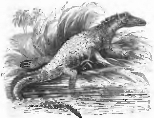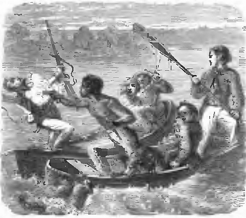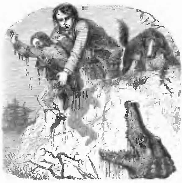 “I will let Peter rest on it while I make my way to the shore, and, after recovering my strength, I will go off and tow him in,” I thought to myself: and then I told him what I proposed doing. I swam up to the log, lifted Peter off with my left hand, and had placed him on it, while I kept myself afloat with my right, when Ready began to bark furiously, turning round his head at the log, and swimming off in an opposite direction. I thought this odd, when suddenly the log began to move. A vast pair of jaws, with long rows of formidable teeth, opened, but instead of snapping at me, the alligator (for such it was, and of prodigious size) swam away after my faithful Ready. I eased poor Peter, who, terror-stricken, was about to take a most uncomfortable ride on the alligator’s back, and dragging him off before the creature had towed us many yards, I succeeded, by efforts which the greatest alarm alone could have enabled me to make, in reaching the shore. I climbed up the bank myself, and was dragging up poor Peter, when the alligator, disappointed in catching the sagacious Ready, who was safe on land, furiously barking at him, made a dash towards us. I had just time to draw the boy up by a violent jerk, when the monster’s long jaws closed with a loud clack close to his heels. Peter shrieked out, believing that he was caught, but I soon reassured him, and, by setting him on his legs, proved that he had retained them. The alligator, or cayman, was, however, not to be baulked of his prey, and, not being aware of the number of people floating away helplessly down the stream, he began to climb up the bank with the intention of catching one of us at least. The island was of about twenty acres in extent, with a clump of cypress trees and a palm or two in the centre; but the ground of the greater portion was soft and boggy, and covered with reeds, and long grass springing up among logs of timber, in all stages of decay, which had been washed up during the floods of spring. This was not very convenient ground for active operations; yet still the alligator took care that we should be actively employed. As we had no arms with which to assail him, we could only act on the defensive.