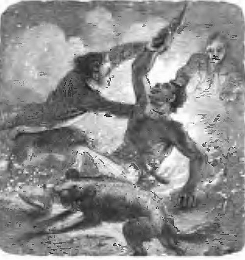 “I am a friend,” I shouted out as rapidly as I could, but the black had not time to change the impulse given to his finger. There was a flash, a report, and a sharp stinging sensation in my neck told me that the bullet had taken effect. To save my life I sprang forward, and throwing myself with all my might on the stranger, I grasped his arm as he was drawing a second pistol, and bearing him down we both rolled over together to the ground and very nearly into the water. He was as strong as I was, and being naked I had great difficulty in holding his arms and preventing him from drawing his knife, which he made strenuous efforts to do, while at the same time he was evidently endeavouring to roll off the bank into the river, and to drag me with him. I could not help thinking of my friend, the cayman, who would probably have most largely benefited by the success of his attempt. When people go to fisty-cuffs, there are seldom wanting alligators to profit by their quarrels. Had I been alone, strong and active as I was, I scarcely know what would have been the result; but I had two trusty friends at hand. We had not been struggling many moments, when Ready, having laid his plans for the campaign, flew at the negro’s legs, one of which he gripped so firmly that the poor fellow roared out with pain; while Peter, after hesitating an instant, caught him by his woolly head and tugged away manfully in an opposite direction. In our struggles we all rolled into the fire—black, boy, dog, and I; and had not our clothes been still somewhat damp, we should have been quickly in flames, and, had the alligator come back, all ready cooked for his supper. As it was, we kicked about the burning ashes, tossing them into the air, when they came down in showers upon us, till, what with the singeing he was undergoing, the biting of the dog, and the pulling of his hair, the negro cried out lustily for mercy.