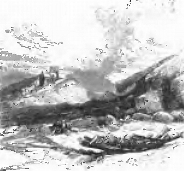 “Our first important raft adventure was in crossing the Canoe River, a tributary of the Columbia. A raft had been constructed. We embarked on it. The current was very strong. I warned my companions. They were deaf to my cautions. I saw that they were not up to navigating a raft. Suddenly, our raft was whirled round in a rapid current, which bore us to seeming destruction. A huge pine tree lay with its branches recumbent on the water. I shouted to my friends to hold on; but it was of no use. Dr Cheadle leaped on shore, followed by the Assiniboine and his boy. I sat firmly at my post; Lord Milton and Mrs Assiniboine hung on to the branch of the tree, like Absolom, only it was with their hands instead of the hair of their heads. To stop the raft was impossible; but to guide it towards the shore was practicable. I sat, therefore, calmly waiting an opportunity of steering my eccentric-moving bark towards a wished-for haven. This, with the assistance, I must own it, of the Assiniboine, I was enabled shortly to do. Lord Milton and Mrs Assiniboine were, meantime, very nearly carried away by the roaring flood. Dr Cheadle and I, at the risk of our lives, hastened to their assistance; and I must do the young nobleman the justice to say that he refused to be helped till we had got the woman out of her perilous position. I look upon that as true gallantry; and I told him that I should consider it a pleasing duty to narrate the circumstance whenever I gave an account of our adventures. However, Dr Cheadle, considering that he was in by far the most dangerous position, got him out at once, and, with the aid of my handkerchief, I helped out the dark-skinned lady.