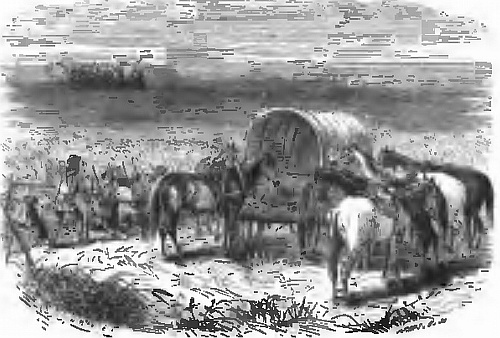 “Well, Master Trevor,” began Habakkuk one evening, as we were seated together, comfortably discussing our wine and cigars, “I’m no way partikler, but there is a place I’ve no wish to go to, though I guess that it ain’t hotter nor worse than Californy was when I first got to it. Ay, long before I got there, I guessed what was to follow; for a full day’s journey along the whole road was like a broker’s shop—only the goods were all smashed and had nobody to look after them. First, there were pianoes, fiddles, guitars, and other gimcracks. Then, chests of drawers, bedsteads, and boxes. Next, women’s fine clothes, bless them! and then bedding, pillows, and blankets. The useless first; then, step by step, one little comfort after ’tother. Then, sadder still, tents and cooking apparatus, skeletons of horses and oxen, broken-down waggons. Now and then, a grave; but, saddest of all, casks of biscuit and crackers, of flour and preserved meats, and whitened human bones!