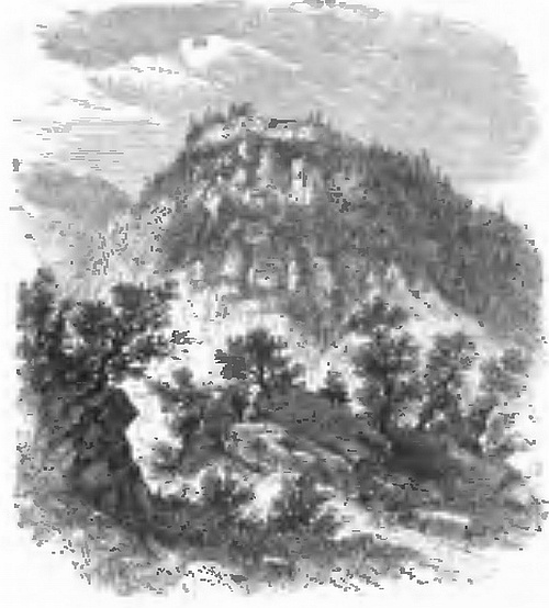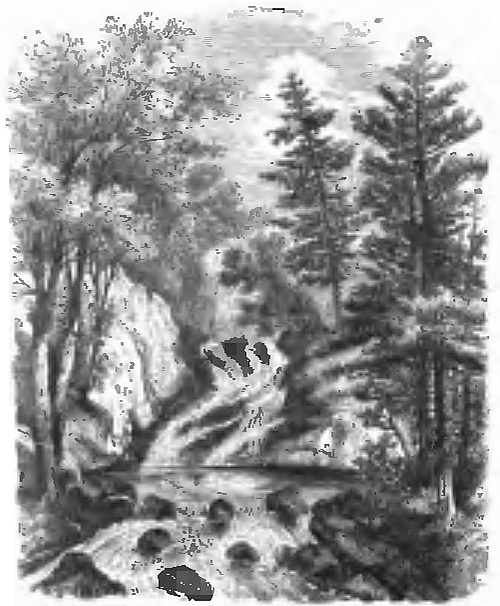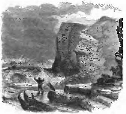 We embarked with as little noise as possible, and now shoving off, followed Stalker down the stream. I experienced a peculiarly solemn and awful feeling so we glided down that dark unknown stream, with the primeval forest rising up on either side, and still more so when we entered a mountainous region where the rocks towered up some twelve or fifteen hundred feet directly above our heads. We feared from the appearance of the river that we might be approaching some rapid. We accordingly moored the raft to a rock, while Stalker paddled on ahead to explore. After waiting for some time, we heard his voice shouting to us to come on. As we were easting off the rope the sound of a paddle was heard up the stream, and we accordingly kept on. In a short time Swiftfoot came alongside. He had waited under the bank, a little lower down than our camp. Suddenly, loud and fearful shrieks rent the air, and a large body of savages burst into our camp. It was certainly better for us not to have been there, and better for them too, for, although we might have killed a number of them, yet that would have been a poor satisfaction if they had killed one of us. They must have been woefully disappointed when they found that the birds they expected to catch had flown. We had now too much reason to fear that Quick-ear had fallen into the hands of the savages. Poor fellow! we could not go back to his assistance, though I must say I felt ashamed of deserting him without further search.