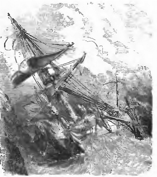 We were dashing on at a prodigious rate—I fancy the engineer must have been sitting on the safety-valve—when, feeling a dreadful concussion, and being thrown forward with my nose on the deck, I heard those around me exclaim, “Snagged!” “We are sinking!” A snag is a log of timber stuck sloping in the mud. Against one of these snags we had run. Down, down sank the huge machine. “Aunt Becky forgot to mention this, among the other modes of losing my life which she enumerated,” I thought to myself. “She forgot that Mississippi steamers could sink as well as blow up.” However, I had no intention of going out of the world just then, if I could help it.