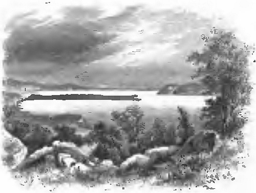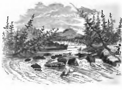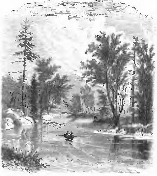 While thus occupied, waiting for the remainder of our party, we distinctly saw several Indians peering at us from among the trees on the opposite side of the river. When they saw that we stopped in our labours and looked towards them they disappeared. This made us somewhat anxious, for it was certain that they could not be well-disposed towards white men, or they would have come out and had some communication with us. They must have seen, however, that we were not a party to be trifled with, and that if they meditated attempting to get possession of our property, they would have to pay dearly for it. As we had still three or four hours of daylight, instead of stopping to dine as soon as the rest of our party arrived, we all embarked and continued our course. The river, however, here expanded into almost a lakelike width, and the current was less rapid than usual, while the wind was adverse, and we made much less progress than we expected. We paddled on as long as we could, wishing to find a convenient camping place on the left bank. After all, we were compelled to land on the right bank, on which we had seen the Indians. We had very little fear of them, however, though it compelled us to keep a more careful watch than we should otherwise have done.