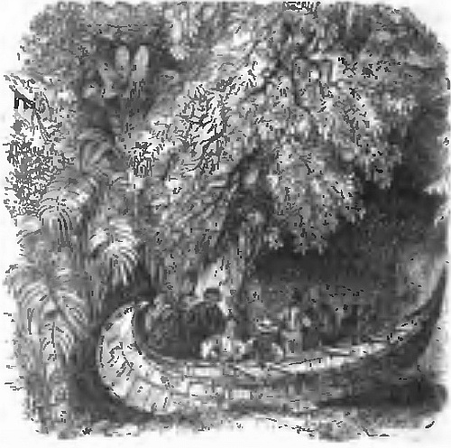 I had little doubt after this that Peter’s heart was in the right place. Night, was coming on, and the danger of our position increased. When the sun went down, the mosquitoes attacked us furiously, and ran their huge probosces into our skins, till there was scarcely a spot without a wound. The only satisfaction was that they kept us awake; for had we gone to sleep, we might have fallen off the bough; and had we fallen off the bough, we should have tumbled into the jaws of the alligator, waiting anxiously below to devour us. Such were the not over-pleasant prospects for the approaching night.
