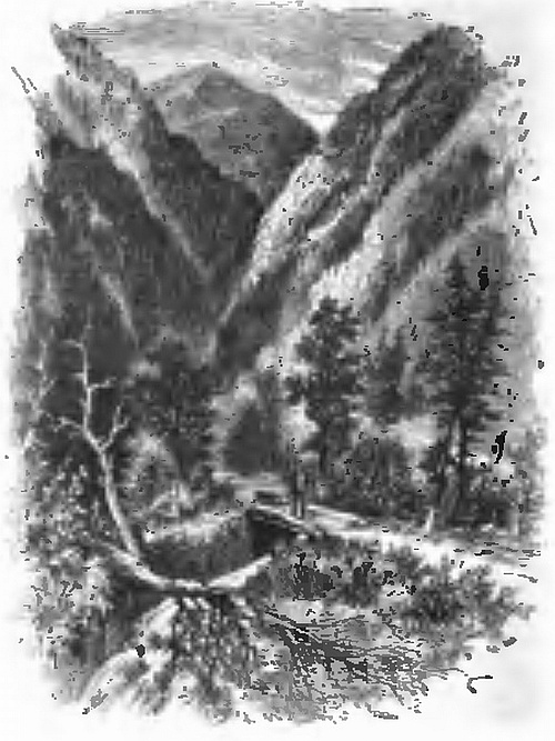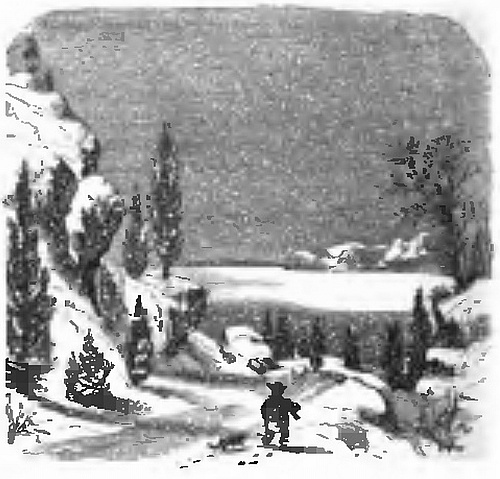 “As soon as we had camped, Donald went back to the river and quickly returned with a fat buck he had killed, and which he had watched for as it went to the stream to drink. We couldn’t sleep much for talking of the fight to come off next day, and for all the brave things we were going to do. By daybreak next morning we were on foot and closely following the trail of our enemies. In three or four hours we reached the place where they had camped, and Donald told us that the varmints had had a good supper on venison, and cakes made of the flour they had stolen, and that there were about five-and-twenty warriors, all well-armed with bows and arrows, and spears, and axes. We now pushed on more rapidly than ever, eager to be up with them. They were also marching quickly to get back to their camp, where they had left their squaws and papooses. Our route lay over mountains and across valleys, with grand scenery on every side. Each mountain we climbed the footprints of the Ingins became more and more distinct, till it was clear that we were rapidly getting up with them. McDonald, like a good general, now sent out scouts to prevent our being taken by surprise. We were told to hold our tongues and to look to our arms. At length we reached the summit of a lofty ridge, below which lay a broad valley.
