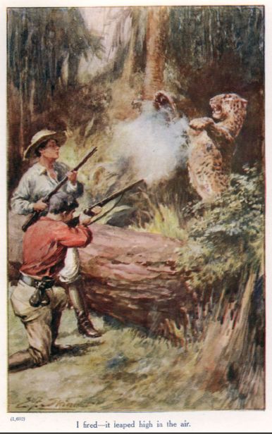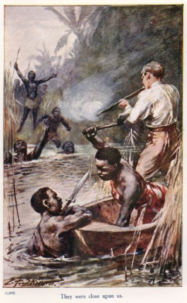 As soon as we found ourselves adrift, we each took a paddle and made down with the current. If we were to save Iguma’s life, we had no time to spare. Already we could see a mass of black forms coming rushing frantically towards the river flourishing their weapons, while the air was filled with the cries they uttered. Two other canoes contained the remainder of our party, Kendo being accompanied by a single faithful attendant who had acted as his henchman and companion on all our hunting expeditions. Just as they were on the point of shoving off, a white man appeared on the bank, and without apparently even asking permission, leapt into one of the canoes. Instantly she shoved off and came paddling after us. Kendo shouted to us to go on and not stop for anything; a piece of advice we saw the wisdom of following.