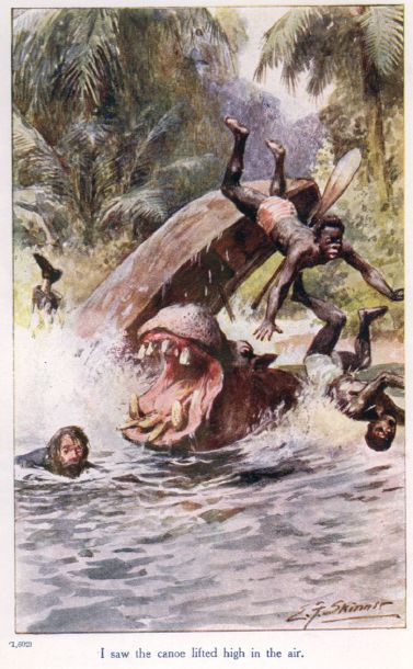 Our canoe was leading, Tom being a little astern. We were just rounding a point where the water was somewhat shallow, when I heard a cry from the canoe astern. Upon looking round, I saw it lifted high in the air, and turned bottom upwards, while beneath it appeared a huge hippopotamus, which was making after one of the men; another man was on the point of being pitched on the creature’s back, the two blacks, with their legs in the air, were falling into the water, and one of the men, who seemed to have sprung on shore, was scrambling up the bank. I saw all this at a glance, the next instant a fearful shriek escaped the swimmer, the huge hippopotamus had pierced him with its tusks, and seemed bent on venting its rage upon him.