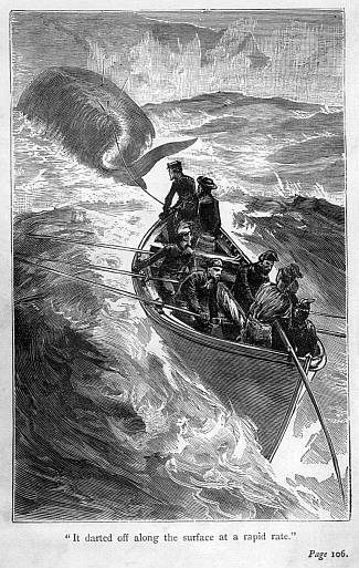 thought. The whale, after remaining so long under water, took a proportionate time to spout on the surface. We were close to it. Medley, making a sign to the bow oarsman to take his place, stepped forward and stood up harpoon in hand. We ceased pulling—the next instant a loud thud showed us that the weapon had struck deep into the monster’s side. He followed up the blow by plunging in three lances, and was about to hurl a fourth when he shouted out “Back off all!” while he allowed the line to run rapidly out of the tub over the bollard. We backed our oars with all our might, knowing that our lives might depend on our getting clear of the monster before it commenced the fearful struggles it was probably about to make. Instead of sounding, however, or lashing the water with its flukes, it darted off along the surface at a rapid rate towards the land. Already a considerable portion of the line had run out when Medley secured it round the bollard, and away we flew, towed by the whale, at a furious rate through the water. The second line was secured to the end of the first, in case the whale should suddenly sound; but this it seemed to have no intention of doing. On and on we were dragged farther and farther from the ships, but we had no thoughts of cutting loose from the whale after all our exertions, and we hoped that, in its endeavours to escape, it would wear out its strength, and thus become an easy prey. Medley stood ready all the time to slacken out more line should its speed become so great as to run the risk of its dragging the bows under water, while the man next him sat with axe in hand prepared to cut it in case there was a probability of the boat being swamped. Nearer and nearer we approached the land, till we could distinctly see the surf rising up in a wall of foam, and breaking over the coral reef surrounding it. We expected every moment that the whale would turn to avoid the danger ahead, and that we should be able to haul in the slack of the rope, and get sufficiently close to give it another wound. That it was losing blood, and consequently its strength, we knew by the red tinge of the water in its wake; still it held on. I glanced towards the shore—I could see a gap in the line of surf, beyond which the land rose to a greater height than anywhere near. It formed, I concluded, the entrance to a bay or lagoon, but seemed so narrow that even a boat would run the danger of being swamped by the surging waters on either side. Galled or terror-stricken as the whale evidently was, I could scarcely suppose that it would run itself on shore, yet from the course it was taking it seemed possible that such it was about to do. Suddenly, however, the roar of the surf growing louder and louder, it appeared to perceive its danger, and leaping almost out of the water it turned away to the northward, giving the boat so violent a jerk that she was nearly capsized. Escaping that danger, we were exposed to another, for the sea, now brought on our beam, continually broke over the side, employing two hands in baling, while often it appeared as if she would be turned completely over. At length the monster began to lessen its speed, and we were hauling in the line to get up to it, when suddenly raising its flukes down it went, dragging out the line again at a rate which made the bollard smoke, but the sea breaking over the bows prevented it from catching fire. The first line was soon drawn out—the second went on, and that, too, speedily ran towards the end. It was vain to attempt stopping it. The whale was now, we knew, swimming under water, and heading away from the shore. It must ere long come up again—but could we hold on till then? Already the seas broke fearfully over the bows. In spite of the efforts of the men baling, the boat was half full of water. Medley seized the axe; the bitter end of the last line was reached. A dark sea came rolling on. Nothing could save us from being swamped, it seemed. The axe descended, a loud thud was heard, the line was severed. “Back off all!” cried Medley, taking the bow oar to steer by. We pulled for our lives; the sea broke under the bows. Scarcely till now were we conscious that, after all our toils, the whale was lost. We had not, as we had hoped, its huge body to hang on to, to protect us from the fury of the fast-rising seas. Darkness had now come on; we looked out in vain for either of the ships. The “Eagle,” on finding that we did not return, would burn blue lights to direct us to her. The “Lady Alice” would do the same should any of her boats be absent. We pulled on against the still rising seas. How long our boat would float amid them was doubtful. “There’s alight, boys!” cried Medley at length; but it was away to the northward, and far off, for it only just appeared above the horizon. To reach it we must bring the sea abeam and run a fearful risk of being rolled over or swamped. Still the attempt must be made, unless we were prepared to remain toiling at the oars all night, or to run the risk of trying to reach the shore. We continued to pull on, keeping the boat’s head to the sea, when, looking round, I observed a glimmering bluish light suddenly spring up on the starboard bow. That it was at an immense distance I knew, as I could not distinguish the body from which the rays of light proceeded. Medley saw it also. “She is hull down, and it would take us till morning to reach her, even if we could do it then,” he said in a tone which showed how serious he thought our condition. Still we could more easily reach the vessel from which the distant light proceeded than the one on our beam.