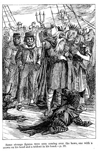 Westerway. “However, you are welcome on board.” As he spoke, some strange figures were seen coming over the bows, one with a crown on his head, a trident in his hand, and a huge nose and brownish beard, which flowed over his breast. He was evidently Daddy Neptune himself. His companions were in sea-green dresses, with conch shells in their hands, and among them were half-a-dozen strange-looking fish, who came walloping about the deck as if they supposed themselves still to be swimming in the water.