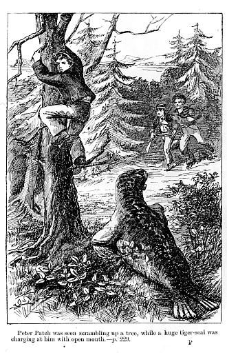The mutineers, for such they evidently were, on seeing the party, hurried on; but as they got halfway across the sandy shore of the bay, a huge seal suddenly darted out of the wood, and seeing the men running, made chase. He soon overtook the nearest, whom he knocked over, giving him a fierce bite, and then rushed at the next, whom he treated in the same way. Willy and Peter, who had stopped on the top of the ridge to rest, hearing the cries, looked round.