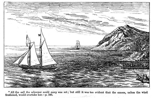 of the harbour; the after-sails were set, and the “Young Crusader” glided rapidly towards the ocean. As she got into the middle of the harbour, the cove in which the canoes lay opened out, and a large number of savages were seen in the act of launching them. They were soon afloat, and, filled with men, made chase after the schooner. Of their hostile intentions there could now be no longer any doubt. On they came, paddling at a rapid rate over the smooth surface of the water. All the sail the schooner could carry was set; but still it was too evident that the canoes, unless the wind freshened greatly, would overtake her. The few fire-arms on board the schooner would avail but little against the vastly superior numbers of the savages. The wind increased; still the canoes were gaining ground. Had the captain waited to weigh the anchor, the “Young Crusader” would to a certainty have been captured; even now there appeared little probability of her escaping.