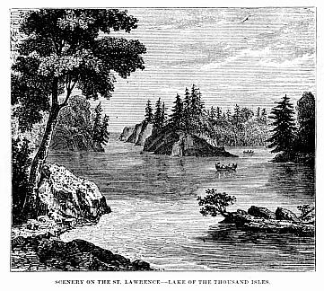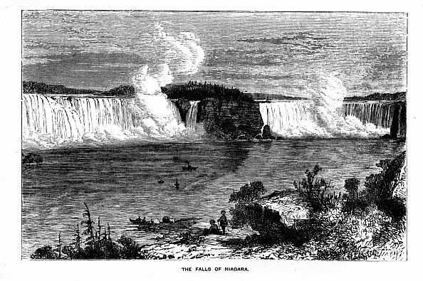 We now come to the site of the five largest fresh-water lakes in the world. Lake Superior extends, from west to east, 335 miles, with an extreme breadth of 175. Its waters flow through the Saint Mary’s River by a rapid descent into Lake Huron, which is 240 miles long. This lake is divided by the Manitoulin islands into two portions, and is connected with Lake Michigan by a narrow channel without rapids, so that the two lakes together may be considered to form one sheet of water. On its southern extremity the waters of Lake Huron flow through another narrow channel, which expands during part of its course into Lake Saint Clair; and they then enter Lake Erie, which has a length of 265 miles, and a breadth of 80 miles. It is of much less depth than the other lakes, and its surface is therefore easily broken up into dangerous billows by strong winds. Passing onward towards the north-east, the current enters the Niagara River, about half-way down which it leaps along a rocky ledge of 100 feet in height, to a lower level, forming the celebrated Falls of Niagara, and then passes on in a rapid course into Lake Ontario. The fall between the two lakes is 333 feet. Lake Ontario is 180 miles long and 65 miles wide. Out of its north-eastern end falls the broad stream which here generally takes the name of the Saint Lawrence, and which proceeds onward, now widening into lake-like expanses full of islands, now compressed into a narrow channel, in a north-easterly direction. The true Saint Lawrence may indeed be considered as traversing the whole system of the great lakes of