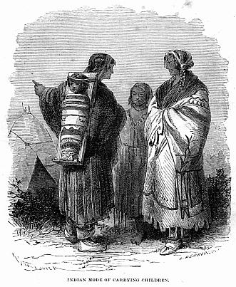 Amid the huts may be seen human figures with dull copper or reddish-brown complexions, clothed in rudely-tanned skins of a yellowish or white hue, and ornamented with the teeth of animals and coloured grasses, or worsted and beads. Their figures are tall and slight. They have black, piercing eyes, slightly inclining downwards towards the nose, which is broad and large. They have thick, coarse lips, high and prominent cheek-bones, with somewhat narrow foreheads, and coarse, dark, glossy hair, without an approach to a curl; their heads sometimes adorned with feathered caps or other ornaments. Often their faces are besmeared with various coloured pigments in stripes or patches—one colour on one side of the face, the other being of a different hue. Their lower extremities are covered with leggings of leather, ornamented with fringes, and their feet clothed in mocassins of the same material as their leggings. The men stalk carelessly about, or repair their canoes or fishing gear and arms; while the women sit, crouching down to the ground, bending over their caldrons, shelling Indian-corn, or engaged in some other domestic occupation; and the children, innocent of clothing, tumble about on the ground. In travelling, the Indian mother carries her child on her back. It is strapped to a board; and when a halting-place is reached, the cradle and the