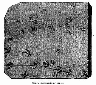 A considerable way to the north of this region, on the banks of the Connecticut River, are beds of red sandstone, on the different layers of which are found the footmarks of long extinct birds. The beds in some parts are twenty-five feet in thickness, composed of layer upon layer; and on each of these layers, when horizontally split, are found imprinted these remarkable footmarks. This result could only have been produced by the subsidence of the ground, fresh depositions of sand having taken place on the layers, on which the birds walked after the subsidence. They must have been of various sizes,—some no larger than a small sand-piper, while others, judging from their footprints, which measure no less