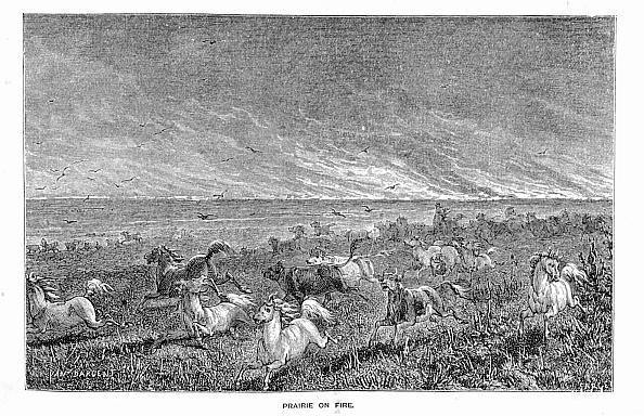 Among the dangers to which the traveller across the prairie is exposed, the most fearful is that of fire. The sky is bright overhead; the tall grass, which has already assumed a yellow tinge from the heat of summer, waves round him, affording abundant pasture to his steed. Suddenly his guides rise in their stirrups and look anxiously towards the horizon. He sees, perhaps, a white column of smoke rising in the clear air. It is so far-off that it seems it can but little concern them. The guides, however, think differently, and after a moment’s consultation point eagerly in the direction of some broad river, whose waters flow towards the Mississippi. “Onward! onward!” is the cry. They put spurs to their horses’ flanks, and gallop for their lives. Every instant the column of smoke increases in width, till it extends directly across the horizon. It grows denser and denser. Now above the tall grass flashes of bright light can be seen. The traveller almost fancies he can hear the crackling of the flames as they seize all combustible substances in their course. Now they surround a grove of aspens, and the fierce fire blazes up more brightly than ever towards the sky, over which hangs a dark canopy of smoke. Suddenly a distant tramp of feet is heard. The very ground trembles. A dark mass approaches—a phalanx of horns and streaming manes. It is a herd of buffaloes, turned by the fire purposely ignited by the Indians. The guides urge the travellers to increase their speed; for if overtaken by the maddened animals, they will be struck down and trampled to death. Happily they escape the surging herd which comes sweeping onward—thousands of dark forms pressed together, utterly regardless of the human beings who have so narrowly escaped them. The travellers gallop on till their eyes are gladdened by the