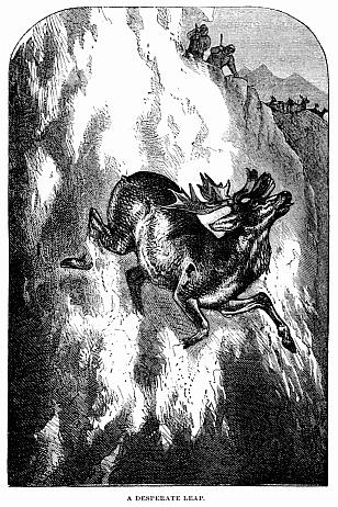 sight of the flowing waters of a river. They rush down the bank. Perchance the stream is too rapid or too deep to be forded. At the water’s edge they at length dismount, when the Indians, drawing forth flint and steel, set fire to the grass on the bank. The smoke well-nigh stifles them, but the flames pass on, clearing an open space; and now, crouching down to the water’s edge, they see the fearful conflagration rapidly approaching. The fire they have created meets the flames which have been raging far and wide across the region. And now the wind carries the smoke in dense masses over their heads; but their lives are saved—and at length they may venture to ride along the banks, over the still smouldering embers, till a ford is reached, and they may cross the river to where the grass still flourishes in rich luxuriance.