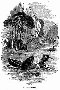 The walls consist of large sheets of birch-bark, layer above layer, fastened to the stakes. On the lee-side is left a small opening for ingress and egress, which can be closed by a sheet of bark, or the skin of a wild animal. At the apex, also, an aperture is allowed to remain for the escape of the smoke from the fire which burns within. Lines are secured to the stakes within, on which various articles are suspended; while round the interior mats or skins are spread to serve as couches, the centre being left free for the fire. In front, forked stakes support horizontal poles, on which fish or skins are hung to dry; and against others, sheets of bark are placed on the weather-side, forming lean-tos, shelters to larger fires, used for more extensive culinary operations than can be carried on within the hut. On the shores are seen drawn up beautifully-formed canoes of birch-bark of various sizes—some sufficient to carry eight or ten men; and others, in which only one or two people can sit.