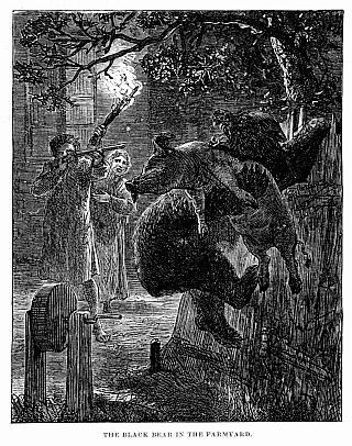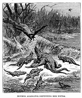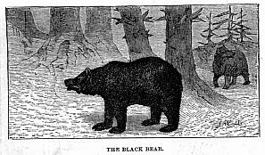 The soil, black as in a peat-bog, is covered with all kinds of aquatic trees and shrubs; yet, strange to say, instead of being lower than the level of the surrounding country, it is in the centre higher than towards its margin; indeed, from three sides of the swamp the waters actually flow into different rivers at a considerable rate. Probably the centre of the morass is not less than twelve feet above the flat country around it. Here and there some ridges of dry land appear, like low islands, above the general surface. On the west, however, the ground is higher, and streams flow into the swamp, but they are free from sediment, and consequently bring down no liquid mire to add to its substance. The soil is formed completely of vegetable matter, without any admixture of earthy particles. In many even of the softest parts juniper-trees stand firmly fixed by their long tap roots, affording a dark shade, beneath which numerous ferns, reeds, and shrubs, together with a thick carpet of mosses, flourish, protected from the rays of the sun. Here and there also large cedars and other deciduous trees have grown up. The black soil formed beneath, increased by the rotting vegetation, is quite unlike the peat of Europe, as the plants become so decayed as to leave no traces of organisation. Frequently the trees are overthrown, and numbers are found lying beneath the surface of the soil, where, covered with water, they never decompose. So completely preserved are they, that they are frequently sawn up into planks. In one part of the Dismal Swamp there is a lake seven miles in length, and more than five wide, with a forest growing on its banks. The water is transparent, though tinged with a pale brown colour, and contains numerous fish. The region is inhabited by a number of bears, who climb the trees in search of acorns and gumberries, breaking off the boughs of the oaks in order to obtain the acorns; these bears also kill hogs, and even cows. Occasionally a solitary wolf is seen prowling over the morass, and wild cats also clamber amid its woods. Even in summer, the air, instead of being hot and pestiferous, is especially cool, the evaporation continually going on in the wet spongy soil generating an atmosphere resembling that of a region considerably elevated above the level of the ocean. Canals have been cut through this swamp. They are shaded by tall trees, their branches almost joining across, and throwing a dark shade on the water, which itself looks almost black, and adds to the gloom of the region. Emerging from one of these avenues into the bright sunlit lake, the aspect of the scenery is like that of some beautiful fairyland.
