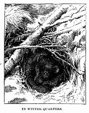 It was down this stream that Captain Back, the Arctic explorer, made his way, but was compelled to return on account of the inclemency of the weather and the difficulty of finding fuel; the only vegetation which he could discover being fern and moss, which was so wet that it would not burn, while he was almost without fire, or any means of obtaining warmth, his men sinking knee-deep as they proceeded on shore in the soft slush and snow, which benumbed their limbs and dispirited them in the extreme. Through this country the unhappy remnant of the Franklin expedition, many years later, perished in their attempt to reach the Hudson Bay Company’s territory. Here, in winter, the thermometer sinks 70 degrees below zero. Even within his hut, when he had succeeded in lighting a fire, Back could not get it higher than 12 degrees below zero. Ink and paint froze. The sextant cases, and boxes of seasoned wood—principally fir—all split; the skin of the hands became dried, cracked, and opened into unsightly and smarting gashes; and on one occasion, after washing his hands and face within three feet of the fire, his hair was actually clotted with ice before he had time to dry it. The hunters described the sensation of handling their guns as similar to that of touching red-hot iron; and so excessive was the pain, that they were obliged to wrap thongs of leather round the triggers to prevent their fingers coming in contact with the steel. Numbers of the Indian inhabitants of the country perish from cold and hunger every year—indeed, it seems wonderful that human beings should attempt to live in such a country; yet much further north, the hardy Esquimaux, subsisting on whale’s blubber and seal’s flesh, contrives to support life in tolerable comfort.