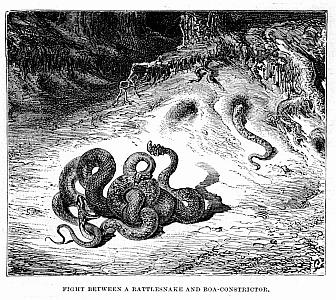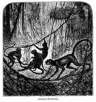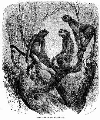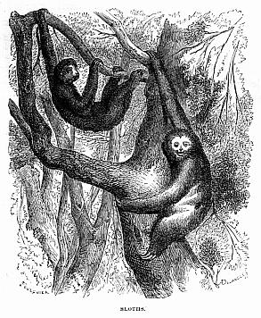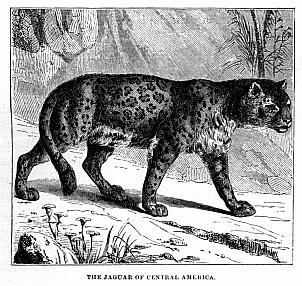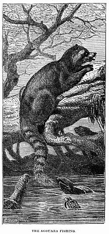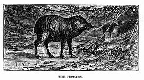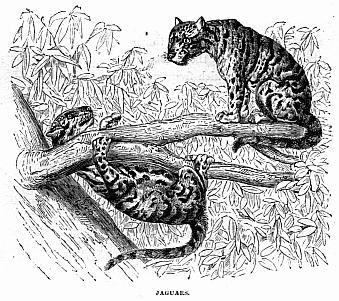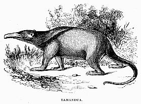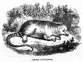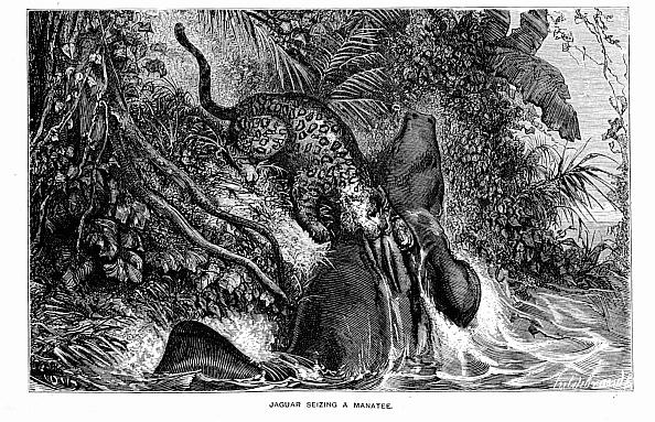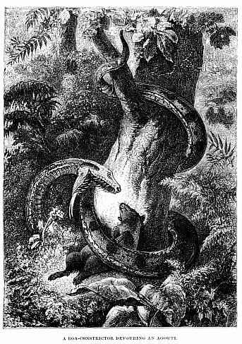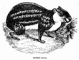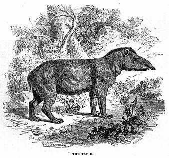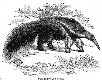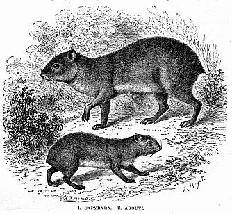 Here, too, the ant-eater reaches an enormous size. The capybara is also found. It is obliged to triturate its food—grass, and herbaceous plants—for a long time, in consequence of the contracted size of the oesophagus, which will hardly admit a goose-quill, although the animal is sometimes so large that it weighs more than two hundred pounds. Its destiny seems to be to feed jaguars, for they live principally on the creatures.