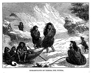 The sole covering of both sexes is a mantle made of huanacu skins—worn with the hairy side in—which can be thrown off in a moment. Their habitations are huts of skin, supported on poles sloping to the ground, towards the direction from whence blows the strong wind or snow from Cape Horn. They sleep, however, in fine weather,—like other tribes further to the north,—on the uncovered ground.