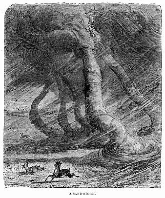Storms break over these plains with tremendous fury: the thunder roars, the lightning which flashes from the clouds illumines earth and sky with a brightness surpassing the cloudless noon. Then again utter darkness covers the earth, when suddenly a column of light appears, like the trunk of some tall pine, as the electric fluid passes from the upper to the lower regions of the world. The next instant its blazing summit breaks into splinters on every side. Occasionally fearful hail-storms sweep over the plains; and at other times the air from the south comes heated, as from a furnace, drying up all moisture from the skin, and parching the traveller’s tongue with thirst.