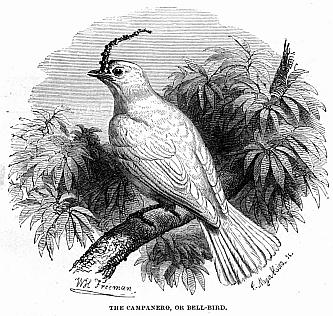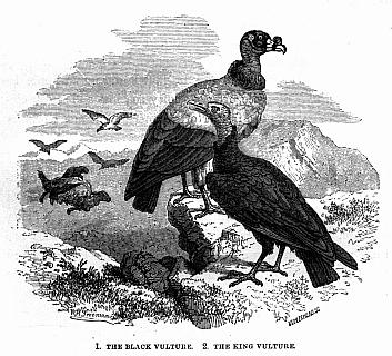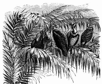 The largest caracara—Polyborus Braziliensis—ranges the grassy savannahs of La Plata. Across the desert, between the rivers Negro and Colorado, numbers constantly attend the line of road, to devour the carcasses of the exhausted animals which chance to perish from fatigue and thirst. It also attends the estancias and slaughtering-houses, accompanied by its smaller relative, the chimango. “When an animal dies on the plain the gallinaso commences the feast, and then the two species of polyborus pick the bones clean,” says Darwin. These birds, although thus commonly feeding together, are far from being friends. When the caracara is quietly seated on the branch of a tree or on the ground, the chimango often continues for a long time flying backwards and forwards, up and down, in a semicircle, trying each time at the bottom of the curve to strike its larger relative. The caracara takes little notice, except by bobbing its head. The caracaras are crafty, and steal numbers of eggs; they also attempt, together with the chimango, to pick off the scabs from the sore backs of horses and mules. These false eagles rarely kill any living bird or animal; and their vulture-like, necrophagous habits are very evident to any one who has fallen asleep on the desolate plains; for, when he awakes, he will see on each surrounding hillock one of these birds patiently watching him with an evil eye. If a party of men go out hunting with dogs and horses, they will be accompanied during the day by several of these attendants.