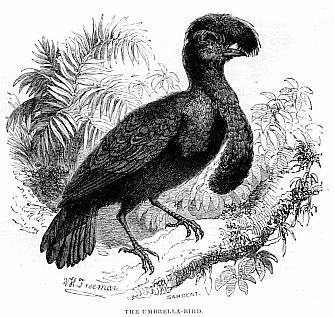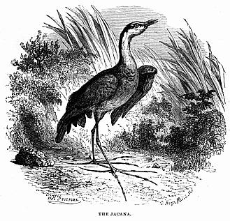 In the same localities the curious boat-bill heron is found,—its short thick neck and enormous beak giving it a clumsy, ungainly look alongside the elegant flamingo. The beak may be likened to two boats, laid one upon the other, gunwale to gunwale, the upper part of the mandible representing the keel. It feeds on the Crustacea which it picks up on the shore, as well as on fish—on which it pounces, as they swim by, from some branch overhanging the water.