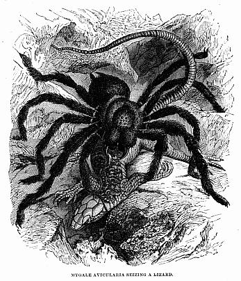 Among the insects, Masterman describes a gregarious spider which, when full-grown, has a black body half an inch in length—with a row of bright red spots on the side of the abdomen—four eyes, remarkably strong mandibles, and stout hairless legs an inch in length. They construct in concert huge webs, generally between two trees, ten or twelve feet from the ground. In a garden, among trees forty feet apart, these spiders had extended two long cables, as thick as pack-thread, to form the margin of each web, the lower being only four feet from the ground; and between them was a light, loose network perfectly divided into webs, each presenting about two square feet of surface. Each of these sub-webs was occupied by a spider from sunset to a little before sunrise. Six nets contained two thousand of the creatures. They often change their location; and a double stream was always passing along the cables, apparently strengthening them as they came and went.